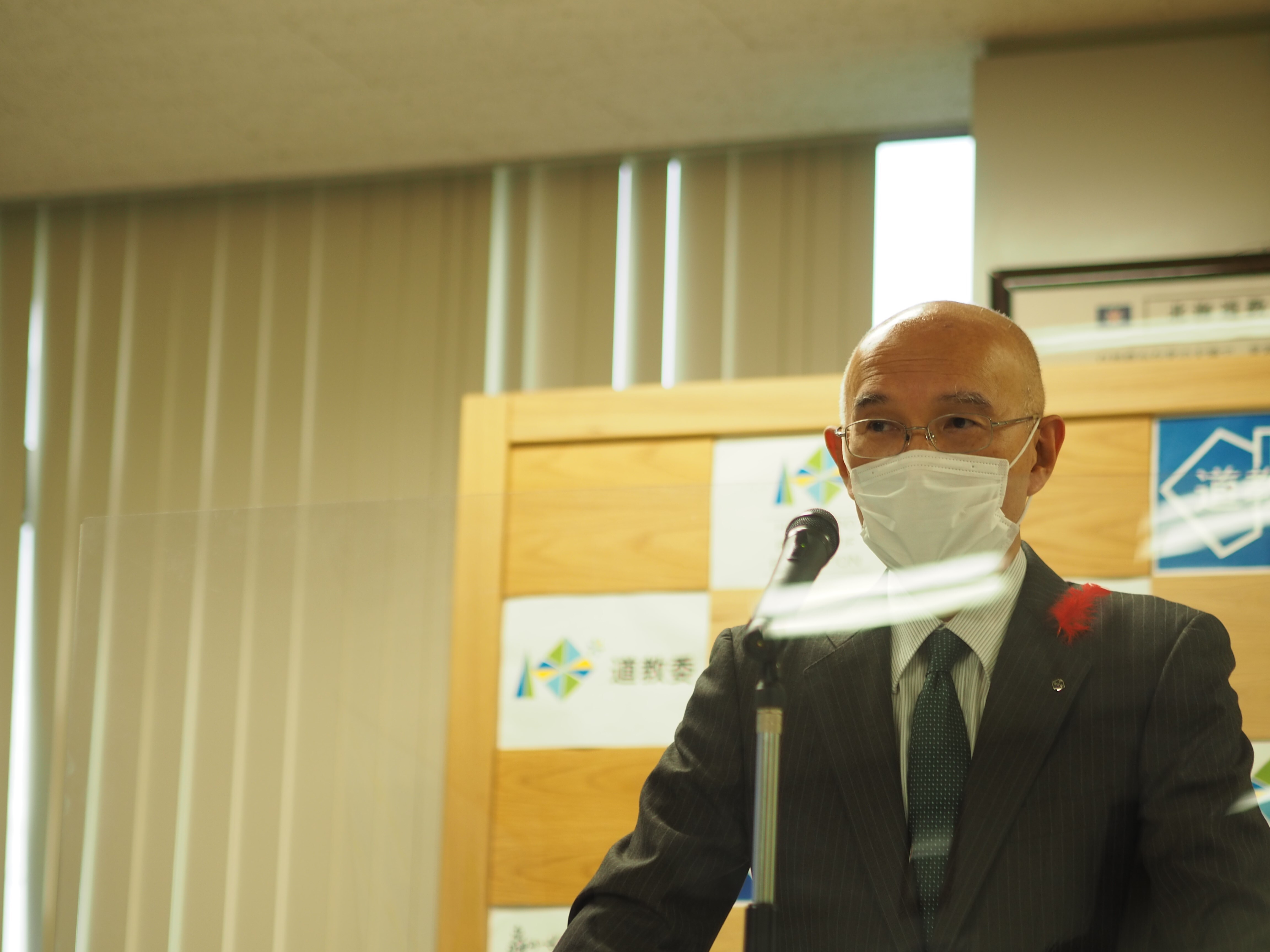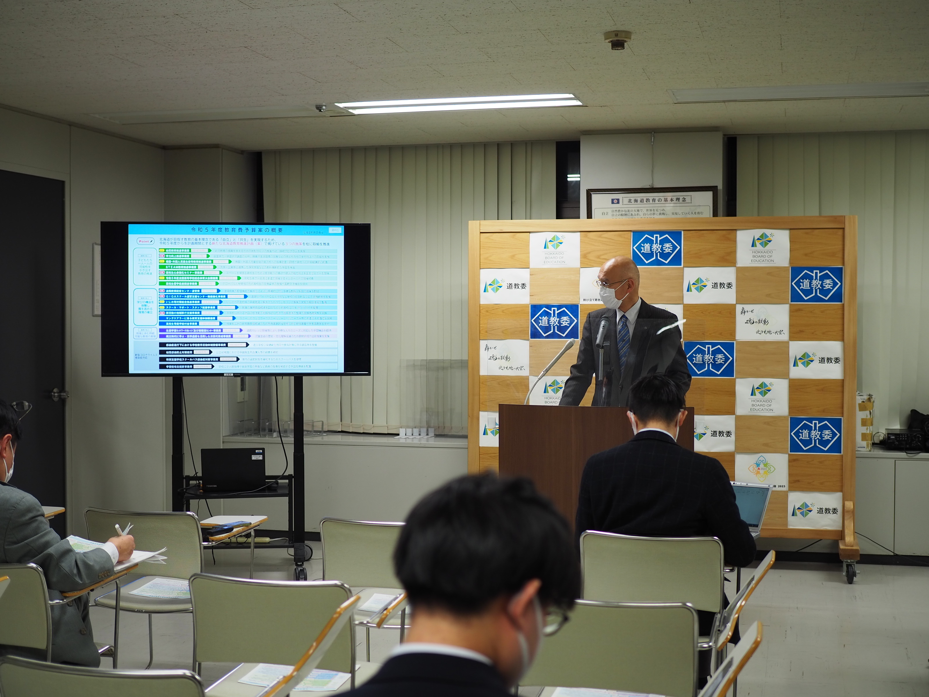 教育長記者会見では、教育長から話題提供するとともに、報道機関からの質問等に答え、教育行政上の課題や道教委の取組み、教育長の考え方を発信しています。
