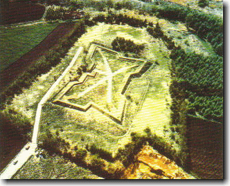 四稜郭は明治2年、旧幕府軍が五稜郭の背後を固めるため急造した洋式の台場で、蝶が羽を広げたような四稜星形をしています。東西約100m、南北約70mと小規模ですが当時の日本では最新の洋式の砦といえます。