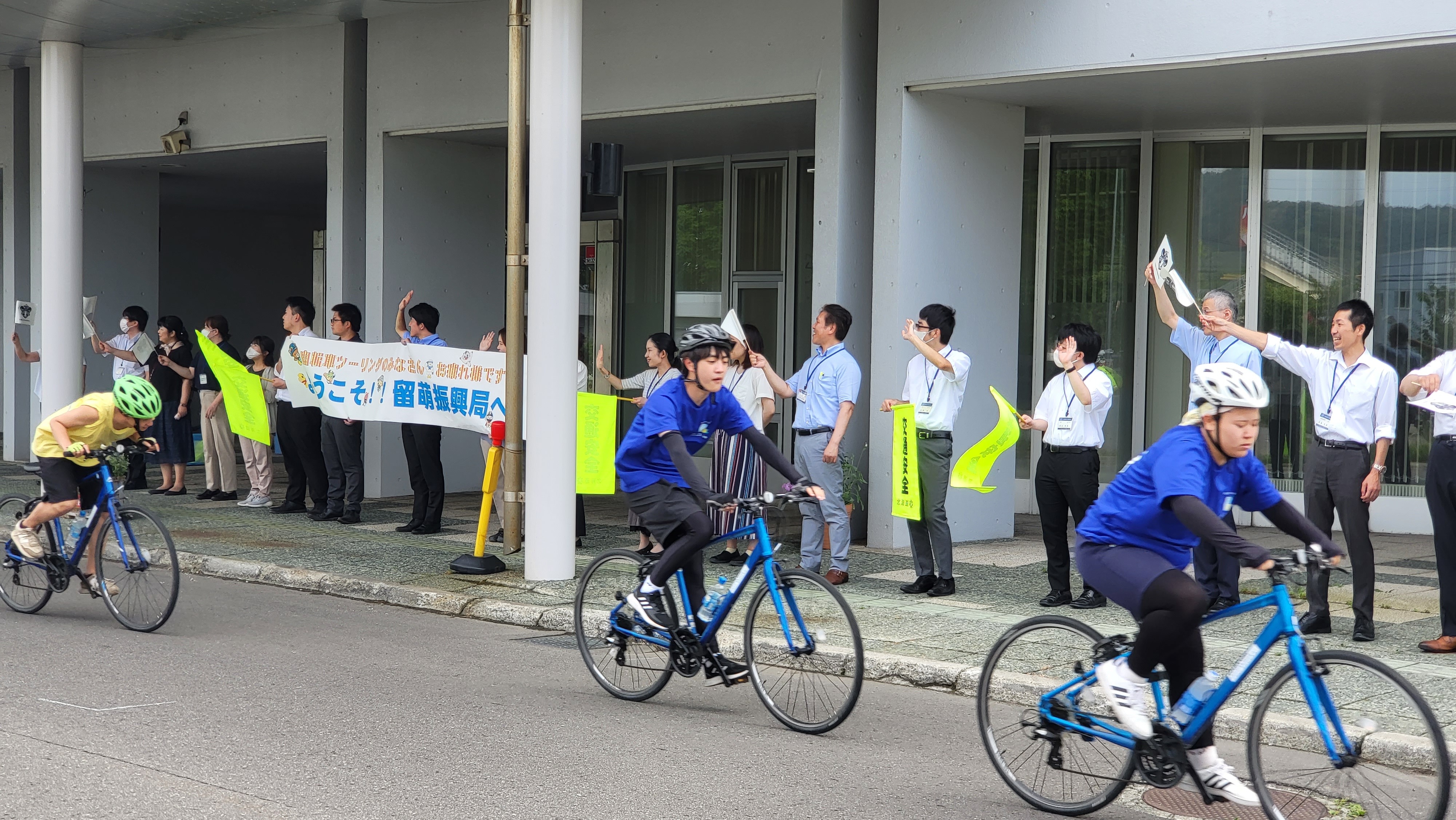 苫前商業高校自転車ツーリング事業2日目の昼食を取るために苫前商業高校生が留萌合同庁舎へ来庁された際に、当局職員で横断幕を掲げ、歓迎のお出迎えとお見送りをしました。
